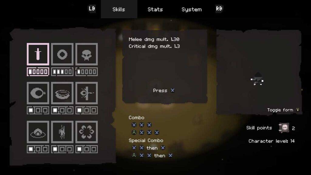 Але бой – гэта, безумоўна, тое, дзе Death Kid ззяе. Ён становіцца лепшым па меры праходжання праз паляпшэнні і разблакіроўкі. Гэта мая адзіная рэальная скарга. Гэта трохі нудна. Вы ніколі не атрымліваеце столькі вопыту, колькі, на вашу думку, павінны атрымаць, і гэты вопыт патрэбны, каб атрымаць навыкі/павышэнне статыстыкі, неабходныя для рэальнага прагрэсу. У прынцыпе, бываюць выпадкі, калі ўсё ідзе не так добра, і вам здаецца, што вы патрацілі ўсяго 2-10 хвілін і нікуды не дайшлі. Але, я думаю, гэта тое, чаго вы, верагодна, чакаеце ад roguelike-гульні на дадзены момант. Рабіце рэчы, набірайцеся вопыту, удасканальвайцеся. Часам усё ідзе добра, часам не вельмі.