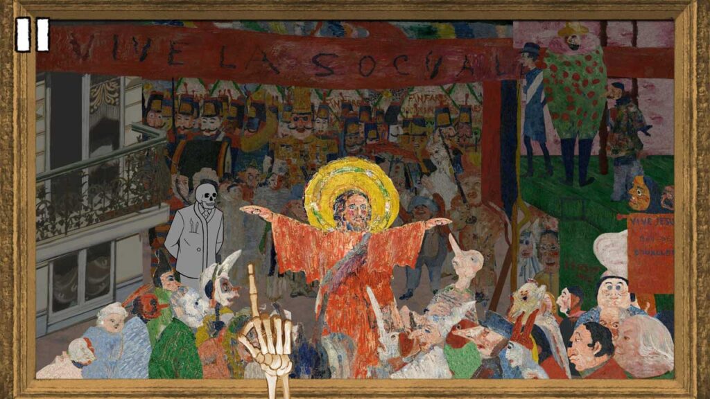 Што да сюжэту гульні, мы наведваем розныя творы мастака, калі шкілет Джэймса Энсара вынырне з магілы (я не жартую), і сюжэт адначасова просты і крыху больш складаны, чым можа здацца на першы погляд. Мы гуляем за нейкага «чэрапа» (як я ўжо выбраў назву), ён апрануты ва ўсё белае і трымае рукі за галавой, быццам у яго вось-вось адваліцца спіна. У яго таксама мілая ўсмешка, якая нагадвае мне Санса з Undertale.